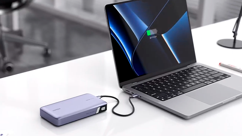 This portable charger delivers up to 65 watts through its USB-C port, which is enough to charge a laptop quickly, reaching about 50% in under 40 minutes. When more than one device is connected, it can distribute up to 100 watts total, making it a practical option for work, travel, or daily use.